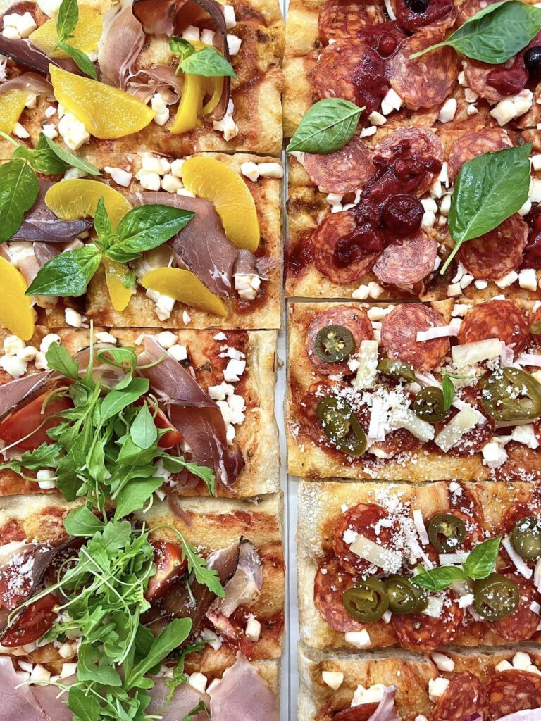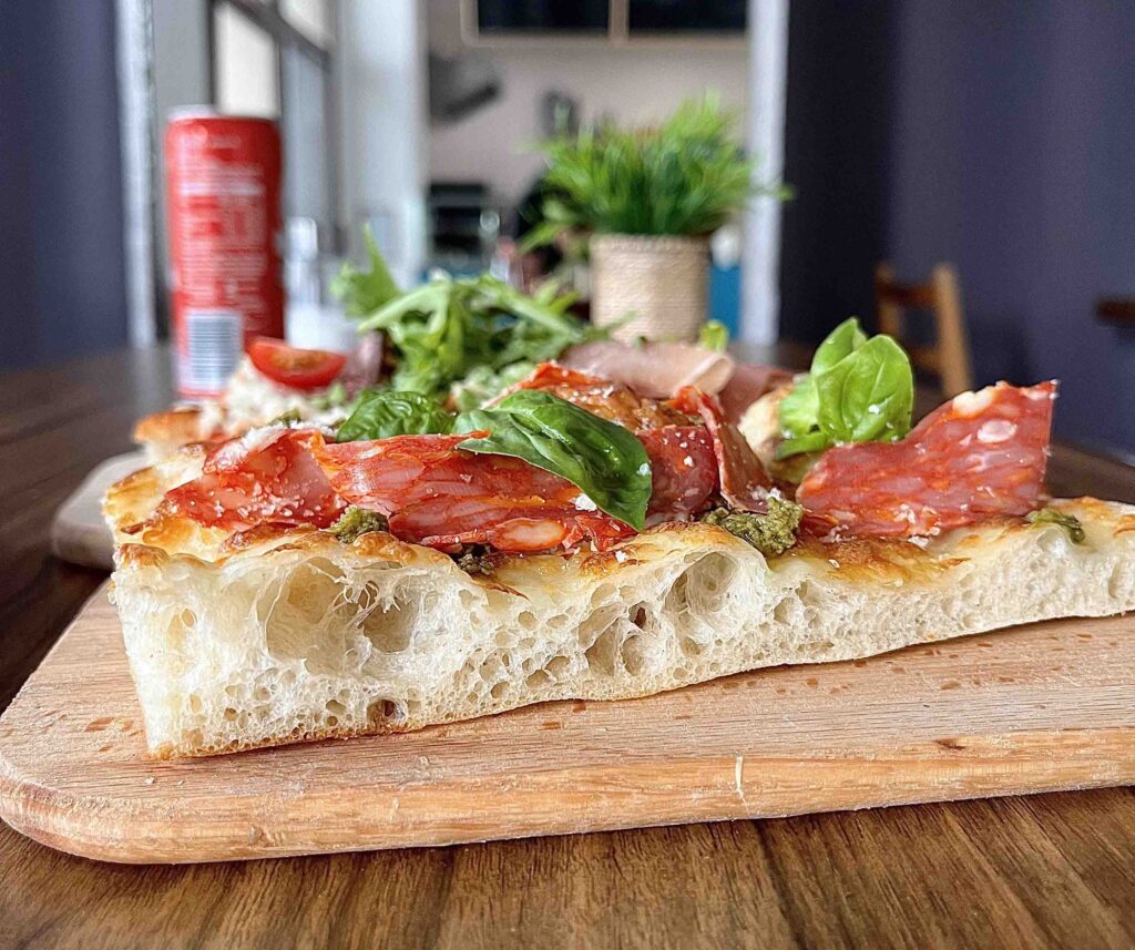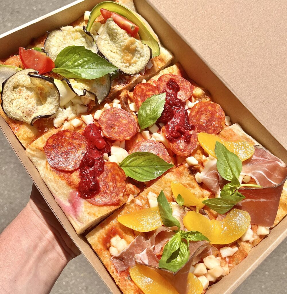 Érződik a 72 órás kelesztés, ami során a tészta sokkal jobban emészthető, mint a nápolyi típusú pizzák, és kevesebb szénhidrátot is tartalmaz. Ezeket a pizzákat kóstolhatjuk szeletben és egészben is. A szelet itt 10×20 centiméter, az egész pedig 20×30 centiméter. Tepsis pizza jellegénél fogva, a tepsi téglalap alakja adja a formát. A jelenlegi étlapon több, mint 30 féle pizza található, ami szezontól függően mindig változik.